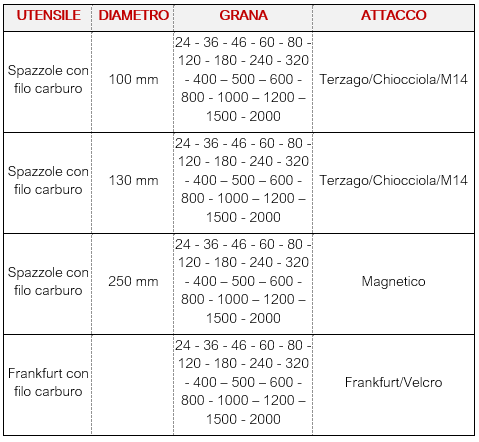 Frankfurt e spazzole con filo carburo, disponibili tre diametri 100mm, 130mm e 250mm e grane dalla 24 alla 2000.