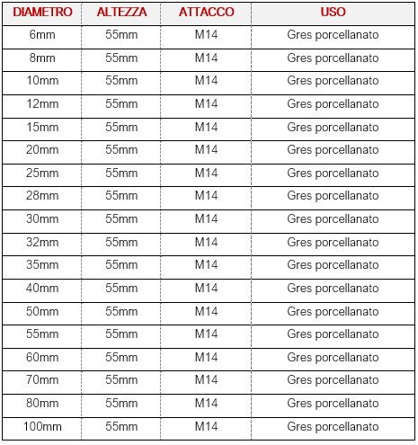 Foretti diamantati utilizzati a secco con settori a lunga durata per piastrelle gres porcellanato.